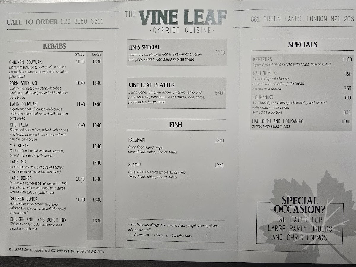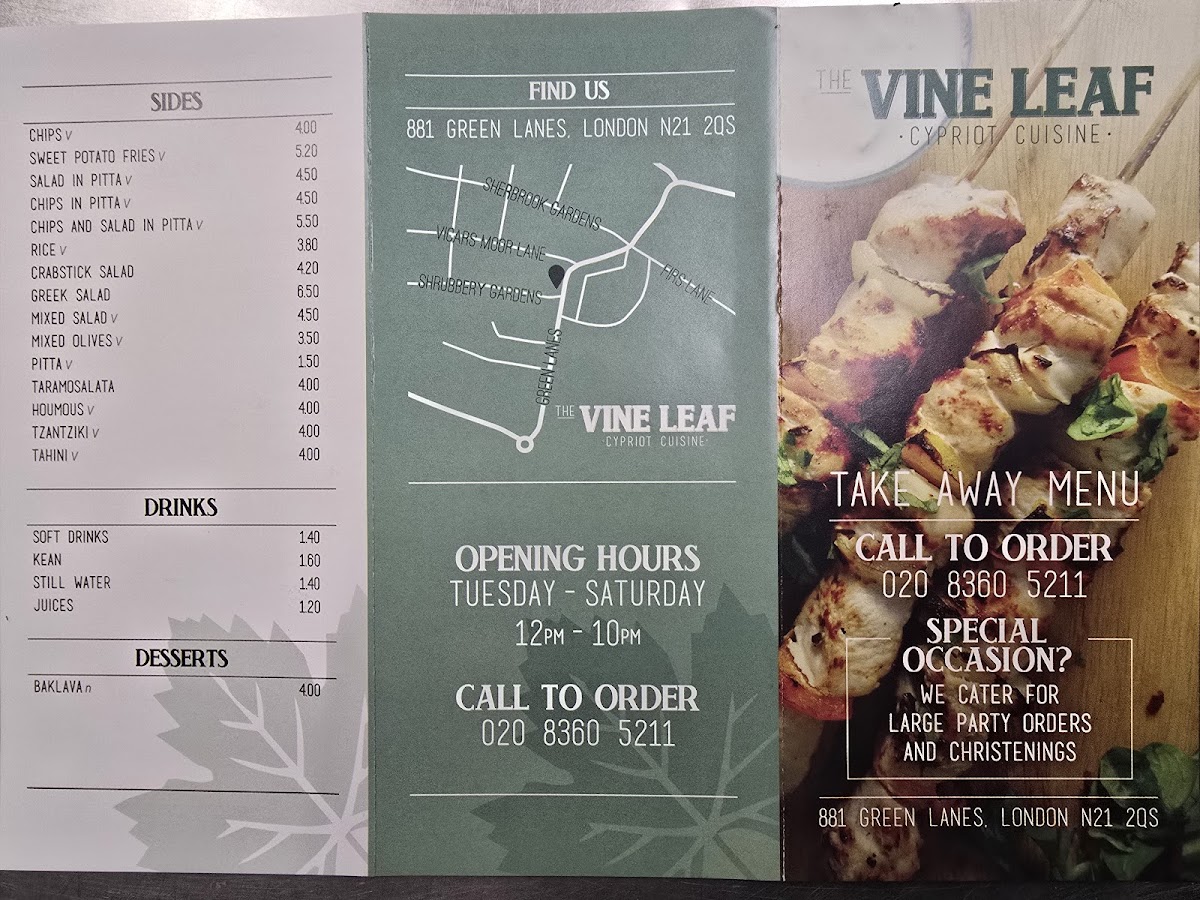 With its combination of high-quality dishes, attentive service, and a charming ambiance, The Vine Leaf offers an exceptional dining experience on Green Lanes. The menu is a reflection of the restaurant's dedication to authentic Mediterranean flavors and its commitment to delivering a delicious and satisfying meal.
